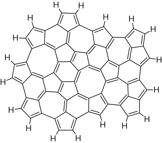 Tę grupę alotropów węgla stworzyłem poprzez łączenie (przez skondensowanie tak, aby uzyskać układ sprzężonych wiązań podwójnych) pierścieni pięcio- sześcio-, siedmio-, ośmio- i dziewięcioczłonowych. Jeden z węglowodorów, który posłużył jako „dwuwymiarowy” model do dalszych konstrukcji, pokazałem poniżej: