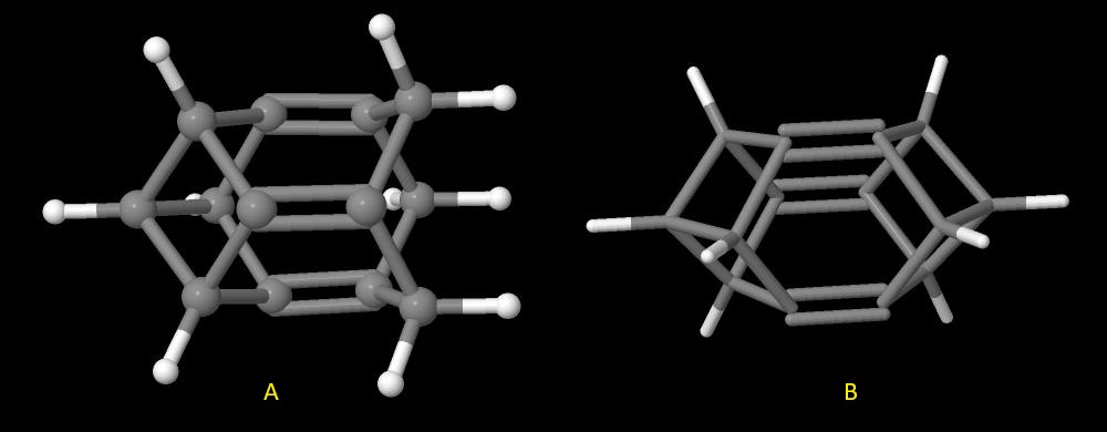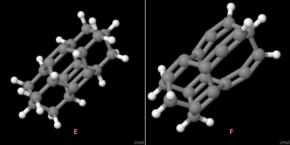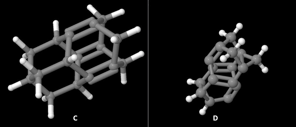 Modele pokazane w części poprzedniej stały się podstawą do konstrukcji struktur pochodnych. Do tego celu zastąpiono niektóre atomy wodoru atomami węgla. Atomy te łączono w odpowiednie, bardziej skomplikowane konfiguracje uzyskując nowe węglowodory. Pierwszą i drugą z nich są struktury uzyskana poprzez zamknięcie z jednej A oraz z dwóch stron B modelu oznaczonego w poprzedniej części literą a za pomocą mostków metinowych:
