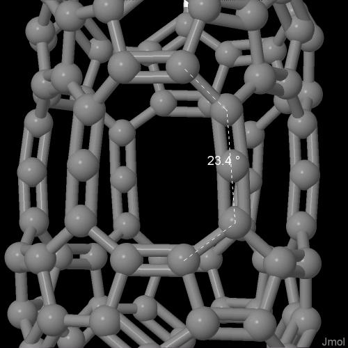 Tutaj relaksacja jest wynikiem (tak sądzę) skręcenia pasów względem siebie (stąd cała grupa to helireny). Analogiczny kąt dwuścienny (pokazany na obrazku powyżej) wynosi około 26° i jest tylko nieco większy niż w poprzednio pokazanej cząsteczce.