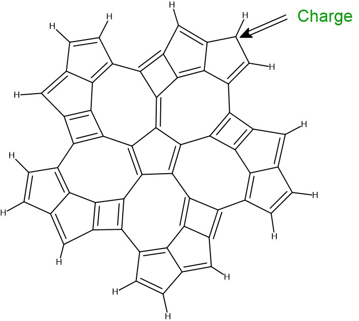 W obliczeniach cząsteczce powyżej nadałem ładunek -1, gdyż tak sugerowała możliwość występowania fragmentów cyklopentadienylowych w formie aromatycznej. Do celów rozpoznawczych poddałem optymalizacji również cząsteczkę kwarbinuB z ładunkiem jednododatnim (MOPAC22/PM7). Co ciekawe procedura optymalizacyjna (BFGS) nadała cząsteczce również formę spłaszczonego siodła, ale procedura FORCE wykazała obecność jednej wartości ujemnej częstości w hessianie. Cząsteczka nie jest więc zrelaksowana w tak zoptymalizowanej postaci.