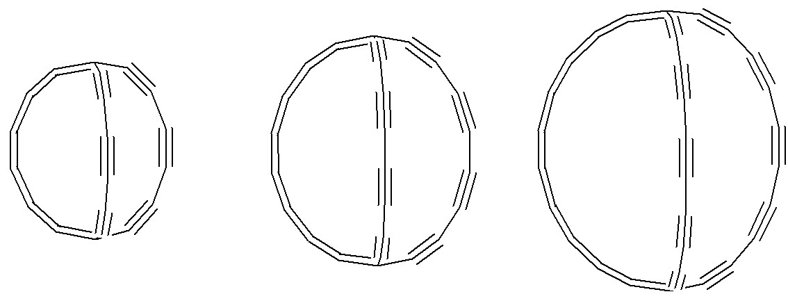 Rys. Trzy odmiany alotropowe węgla w formie bicyklicznej. Struktura po lewej C20, środkowa C26 i po prawej C32