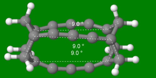 Dla cząsteczki rybenu666 analogiczne kąty wynoszą dokładnie 0°. Oznacza to, że cząsteczka wykazuje przynajmniej jeden element symetrii C3 (Orca4.2.1/B3LYP/def2-SVP/hess-plus):