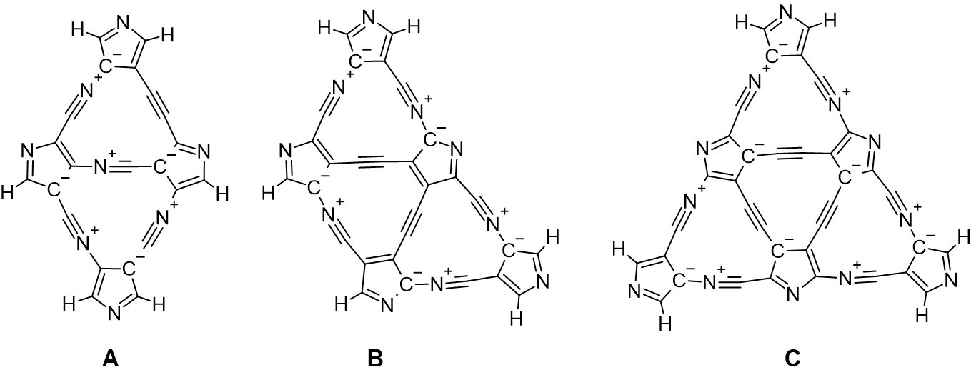 Opisana tu seria związków jest uproszczoną wersją grupy bez nazwy C108N12. Na początku obliczeń przyjrzałem się tetracyklicznemu makrocyklowi pokazanemu poniżej (Orca 4.2.1/ B3LYP/ def2-SVP/ hess-plus):